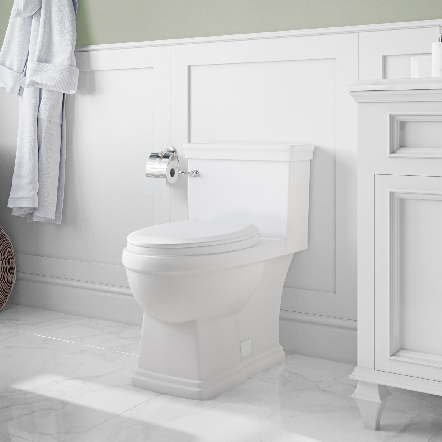 Featuring a classic, understated elegance, the Julian one-piece toilet embodies style that tastefully complements traditional and contemporary bathroom environments. With chair-height and compact-elongated seat dimensions, the Julian combines aesthetics and comfort. Now redesigned with a fully skirted trapway for more modern appeal and easier maintenance.