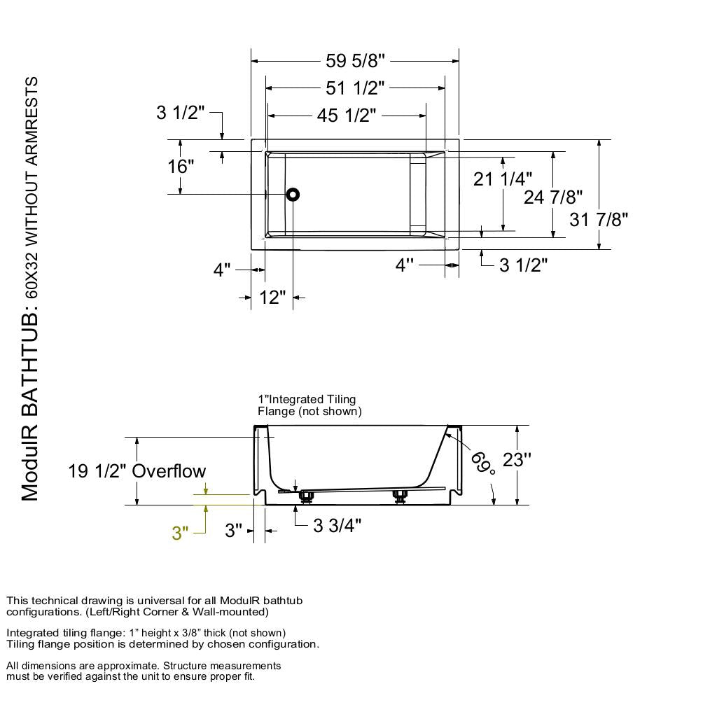 ModulR 6032 (Without Armrests) Acrylic Corner Right Left-Hand Drain Bathtub in White