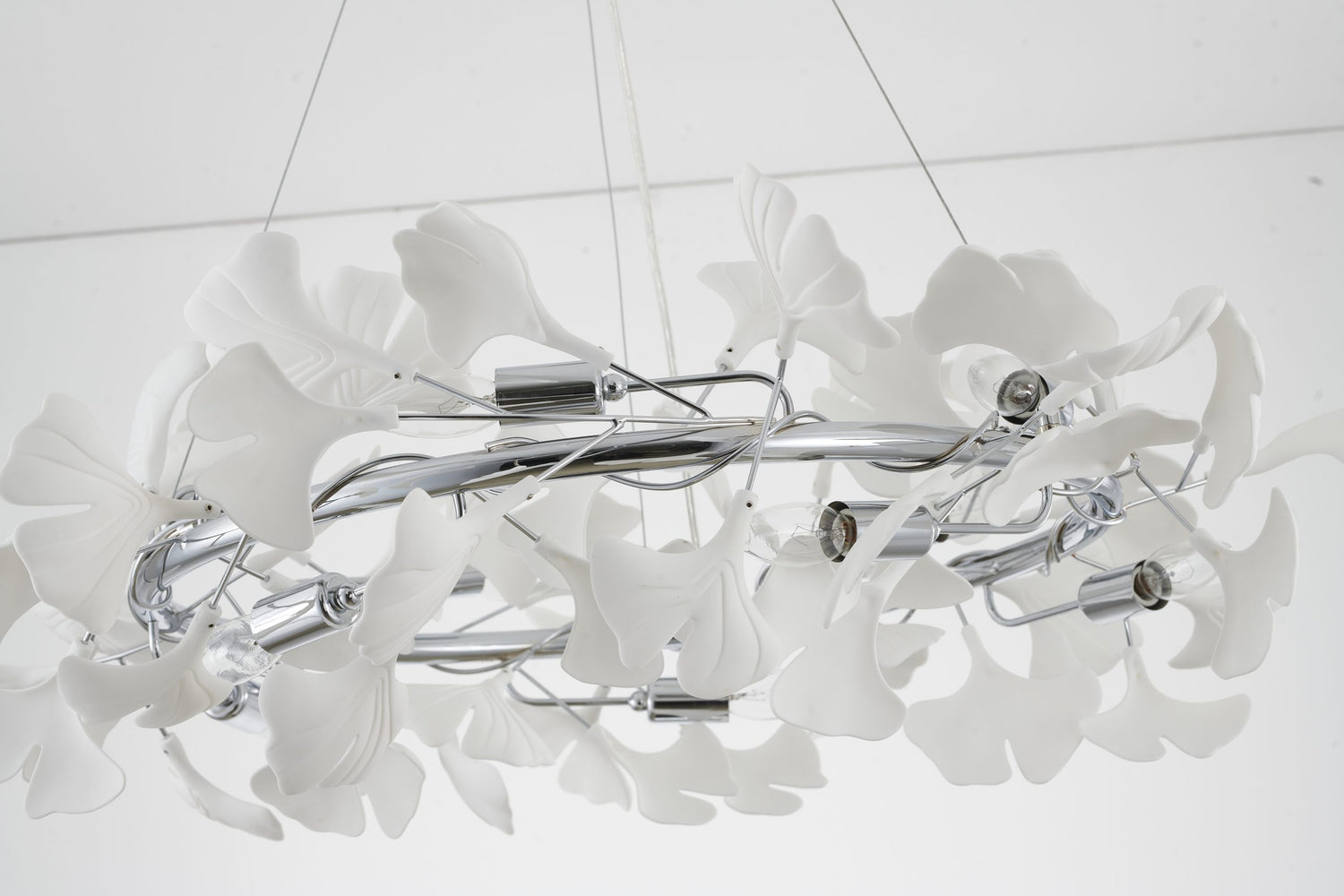 • This chandelier has a chrome iron frame