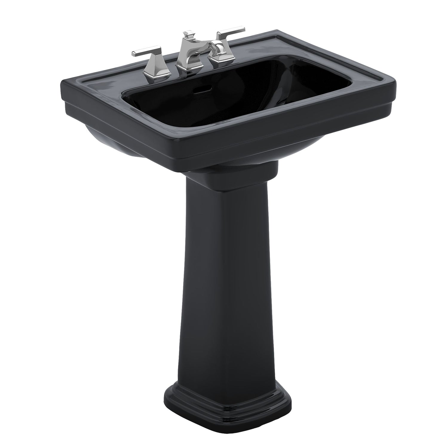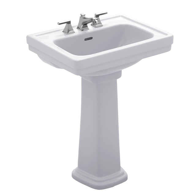 Traditionally elegant with distinctive lines, this pedestal lavatory is bold in design. Features spacious basin, large backsplash and rear overflow. Universal height.
