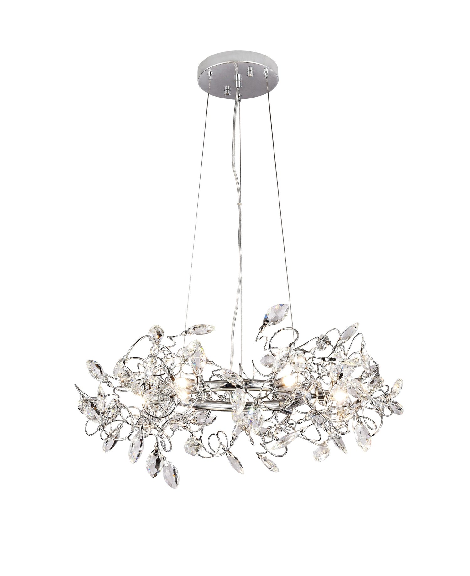 • This chandelier has a chrome metal frame