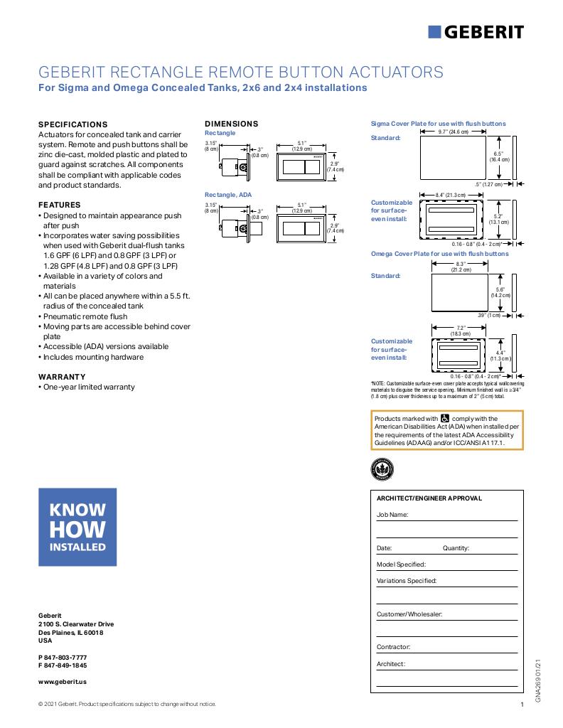 Geberit pneumatic flush buttons let you position the flush actuator to meet personal preference or accessibility requirements. If you need an ADA-compliant installation, choose a Rectangular model with raised buttons. All Rectangular buttons feature dual-flush capability and are made from durable die-cast zinc or plastic. When installing a remote flush button, cover plates are available to hide the standard flush opening and provide access to the fill and flush valves for any required maintenance.