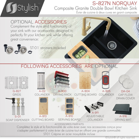 STYLISH 27 inch Dual Mount 60/40 Double Bowl Composite Granite Kitchen Sink with Strainer