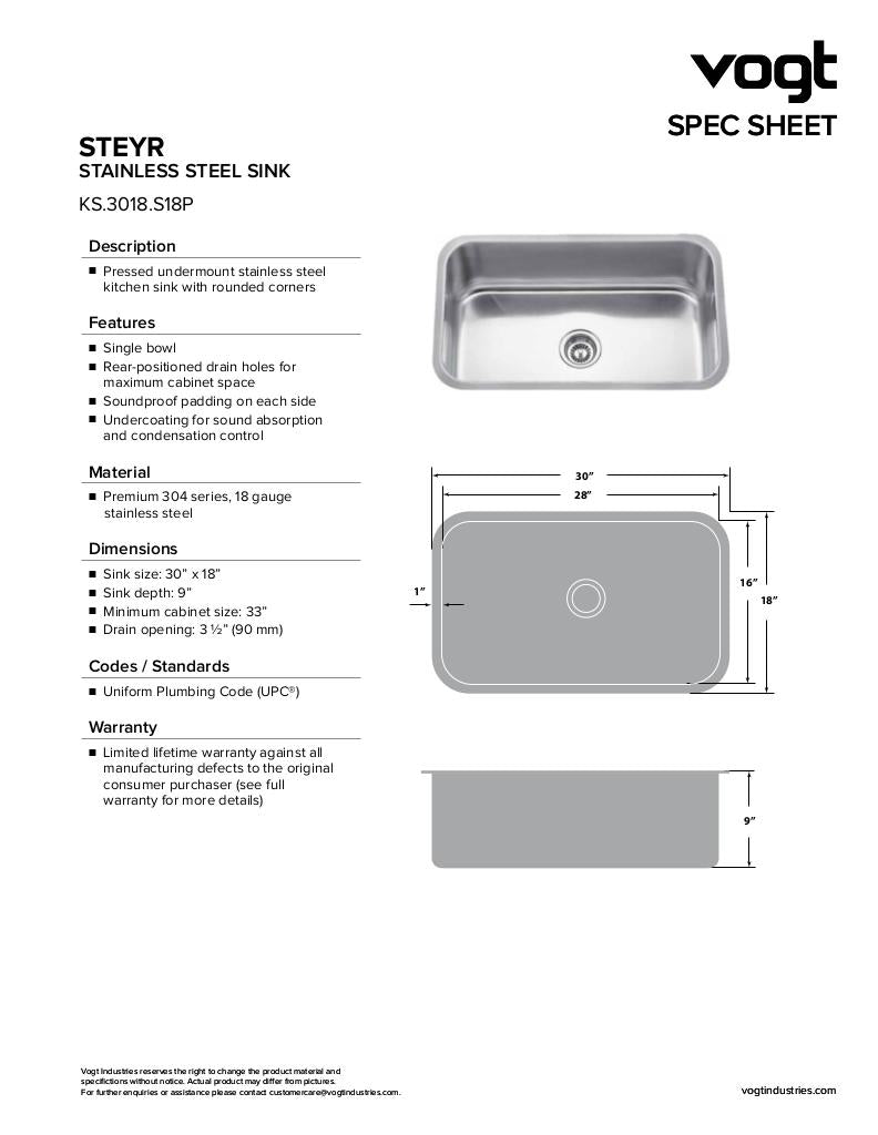 - Stainless Steel - Undermount - Single Bowl - 30" x 18" x 9"Certifications- UPC