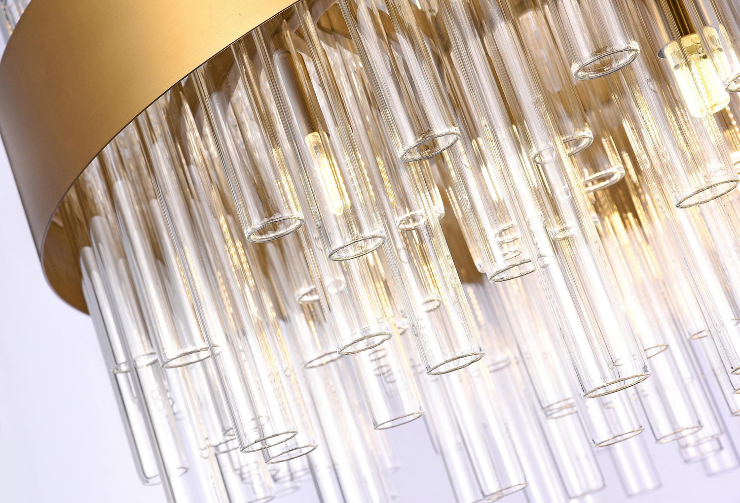 • This modern chandelier has a matte brass metal frame
