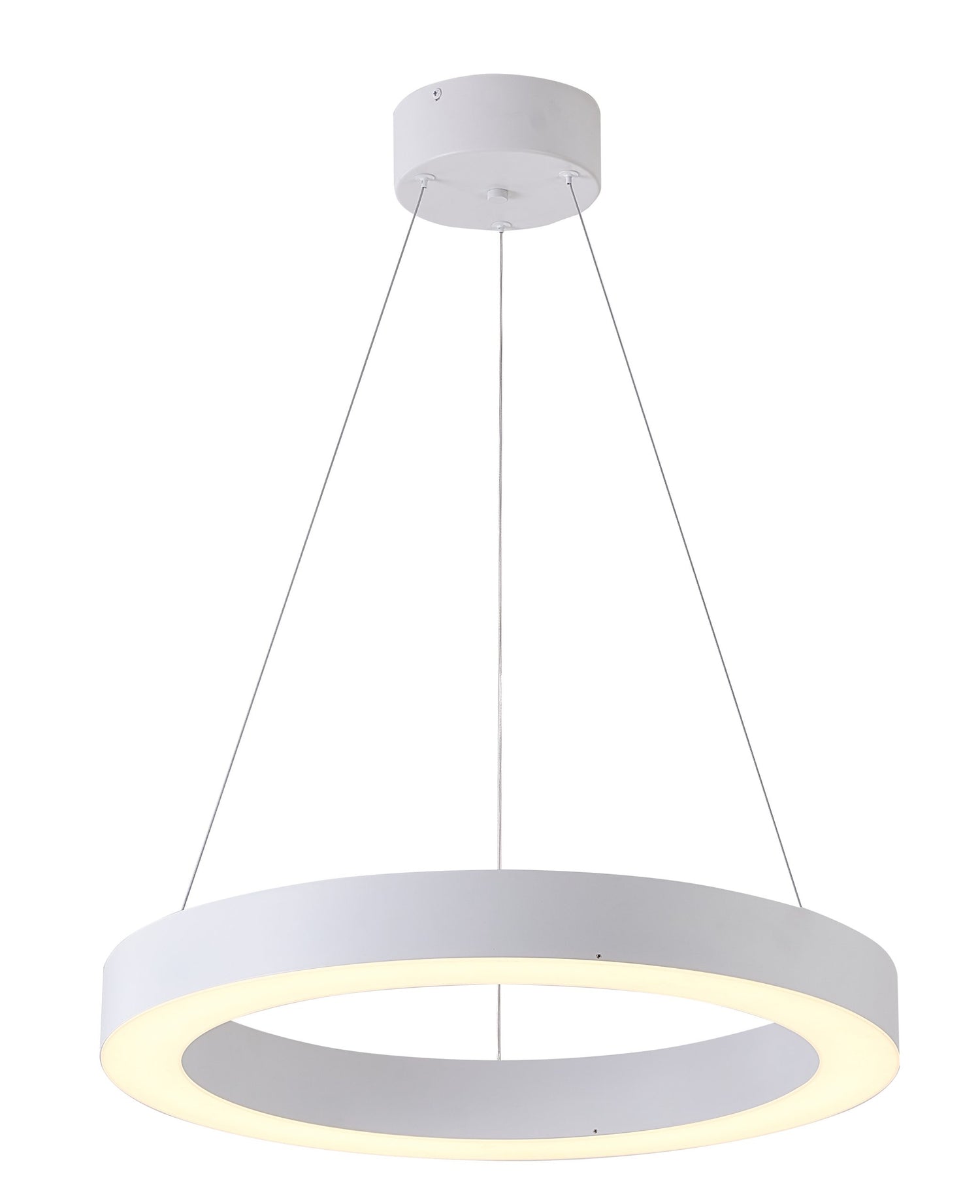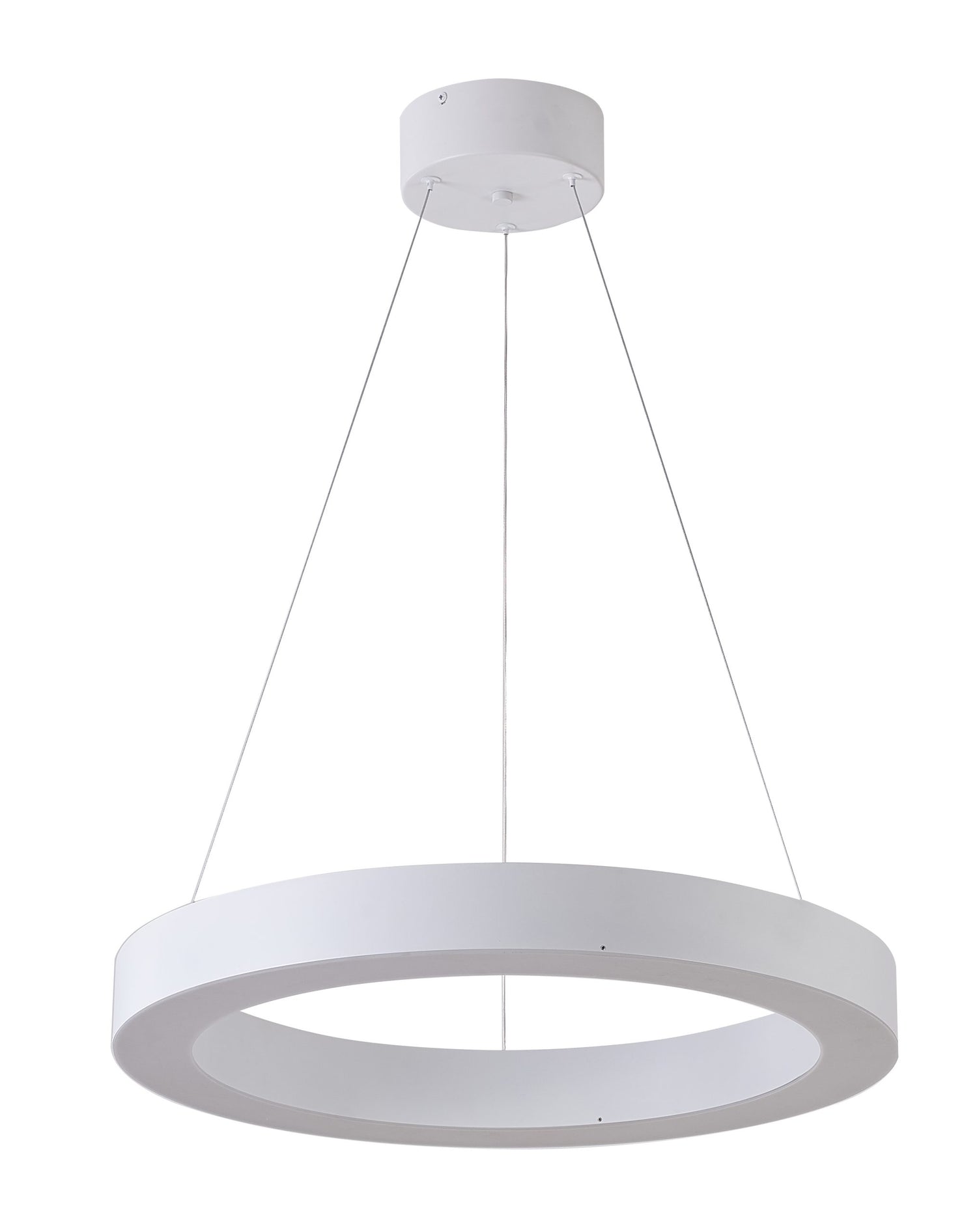 • This LED chandelier has a matte white iron frame