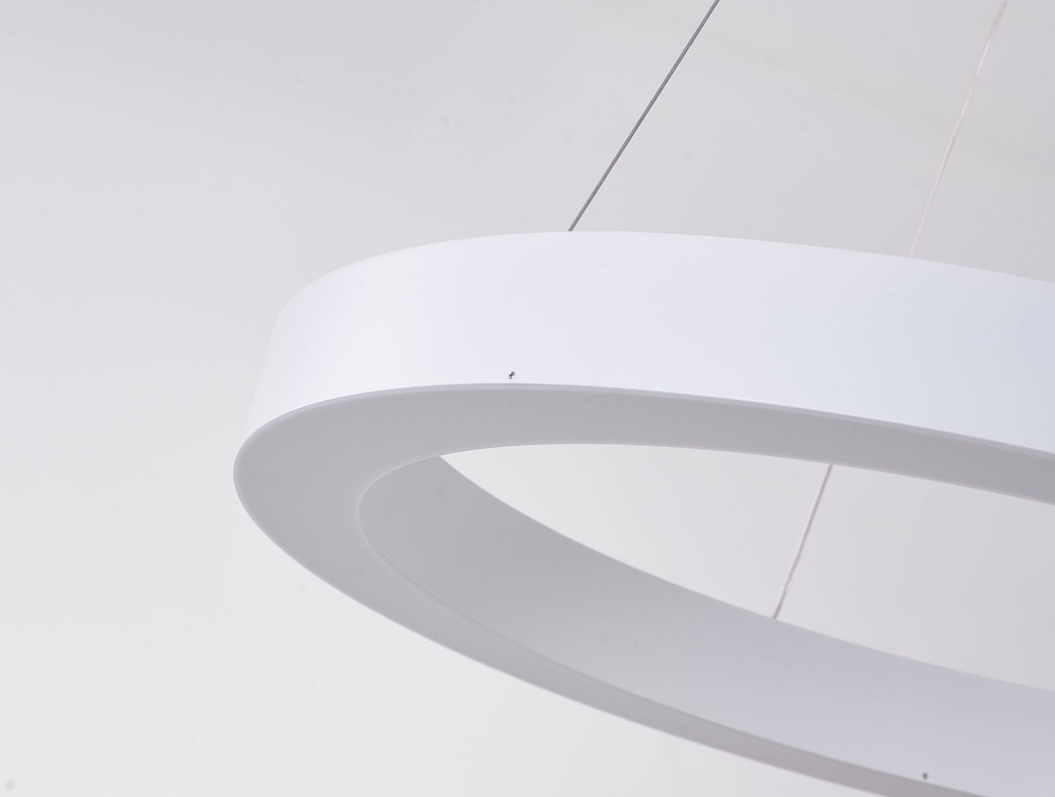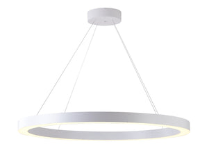• This LED chandelier has a matte white iron frame