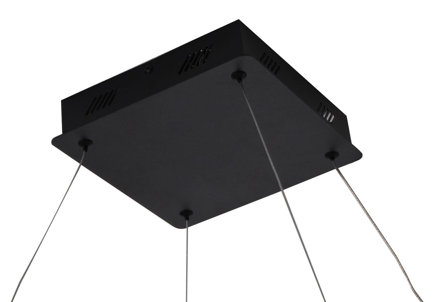 • This LED chandelier has a matte black aluminum frame