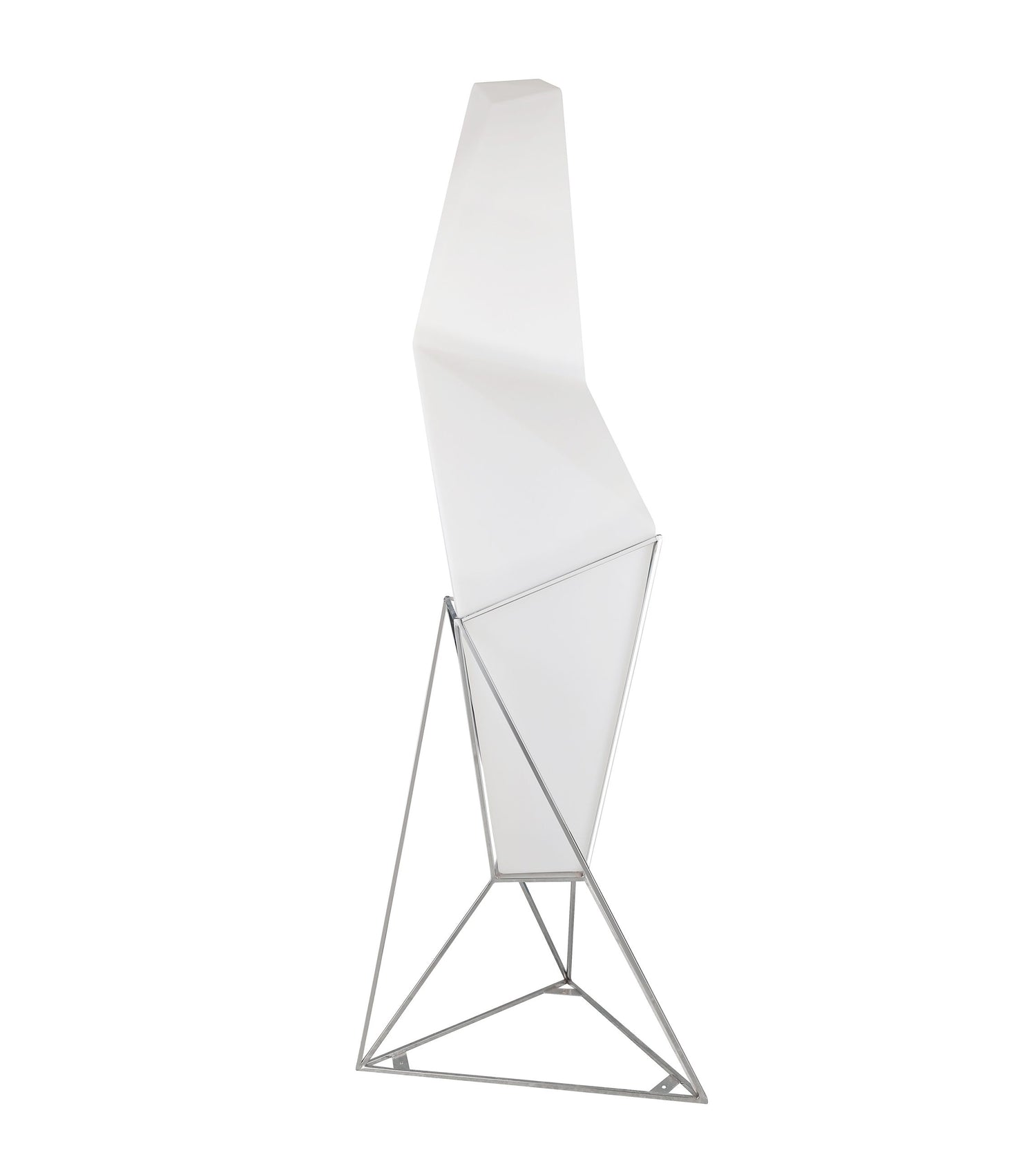 • This floor lamp is has matte white acrylic frame with a chrome metal base