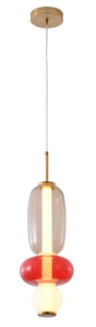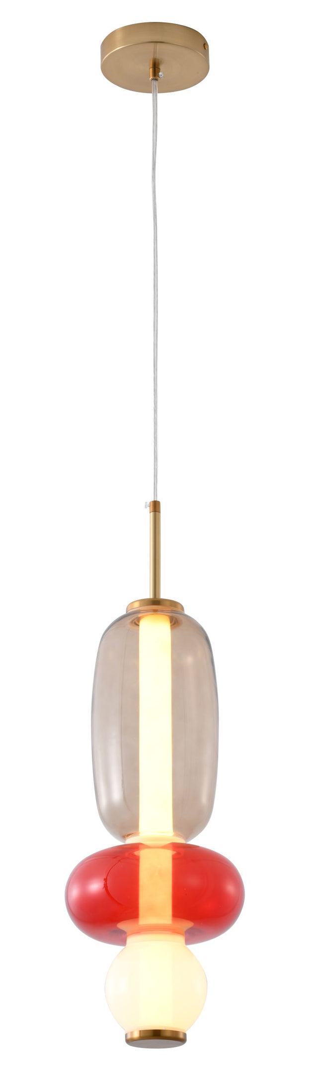 • This LED pendant has a gold metal frame with a white, grey, and red glass shade