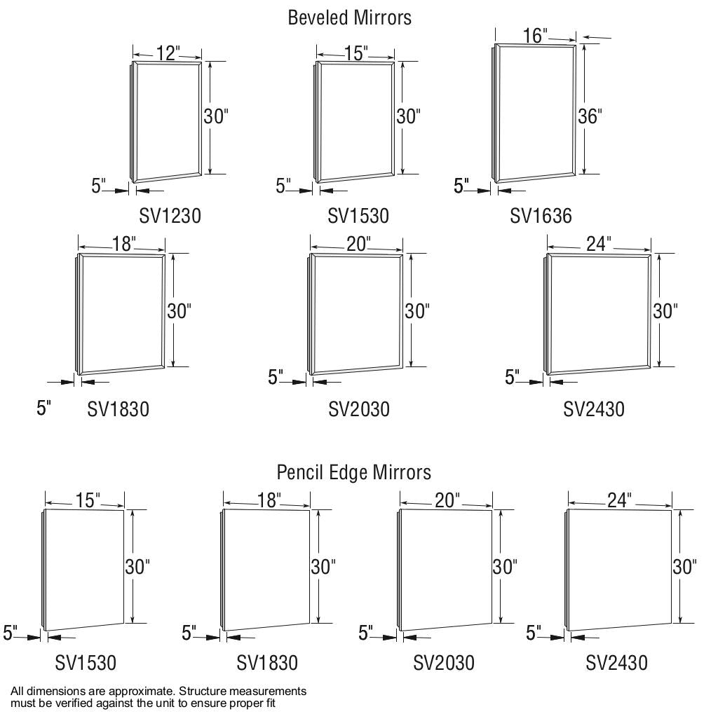 - This MAAX ELEMENT medicine cabinet has a 18-inch width by 30-inch height with a 5-inch depth, has one pivoting panel and a classic 1/2-inch beveled edge and polished chrome base.
