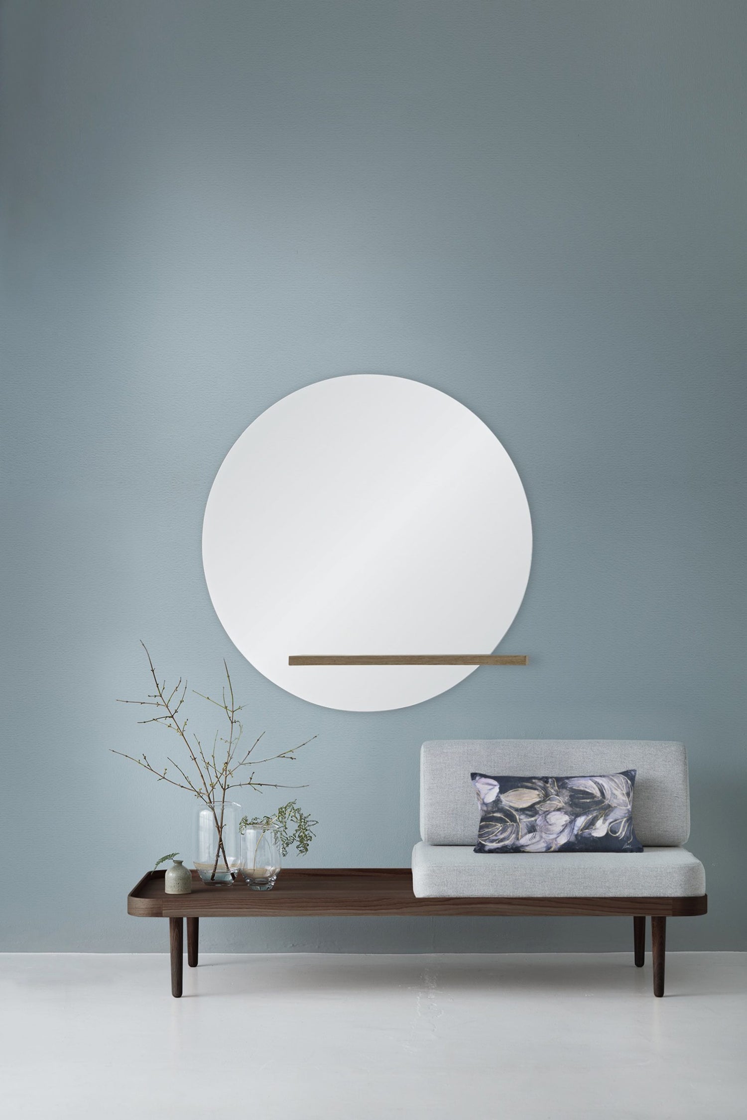 This wall mirror goes above and beyond the ordinary with a wood shelf with light grey veneer finish juxtaposed along its side. Hang within the entryway and take advantage of the shelf’s inherent functionality.