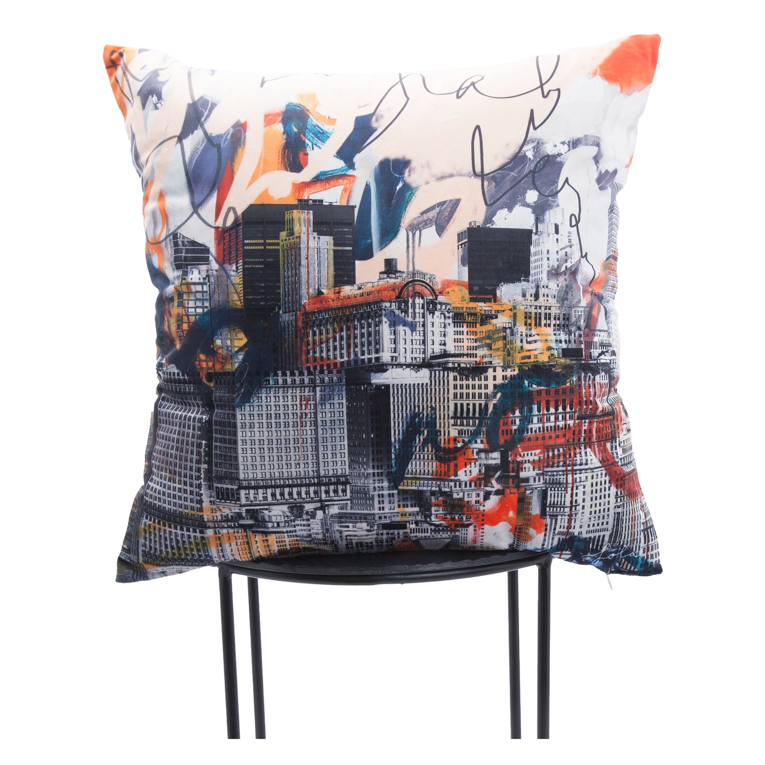 Compose a chic pillowscape on couches and beds with the modern style of this decorative pillow. Printed in graphic detail on a square pillowcase, multicolored gestures overlap a city skyline in an architectural landscape that turns an ordinary cushion into a captivating work of art. A sumptuous combination of duck feathers and down fill the standard pillow sham with enduring softness, offering comfortable cushioning for every seating or sleeping arrangement.