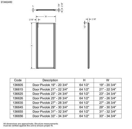 Pivolok 21-22 ¾ x 64 ½ in. Pivot Shower Door for Alcove Installation with Clear glass in Chrome
