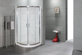 This modern shower kit maximizes space with a neo-round format that fits in the corner of bathrooms big and small. The all-in-one package includes an acrylic shower pan and walls with integrated shelving for ample storage of toiletries and spa accessories. Magnetic seals keep moisture locked in behind the clear glass sliding shower doors while the polished chrome handles and trim are a contemporary complement to existing bath fixtures and hardware.