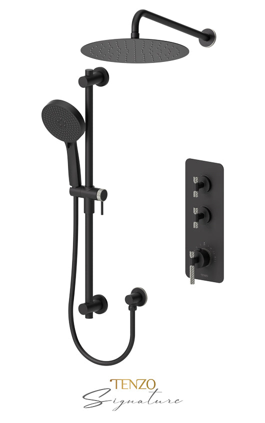 •Extenza rough-in thermo. 2 functions •Extenza valve trims Bellacio thermo. 2 functions •AirBoost shower head round <12"> •Wall mount shower arm •Sliding bar kit •Ceiling shower arm round 15cm <6">