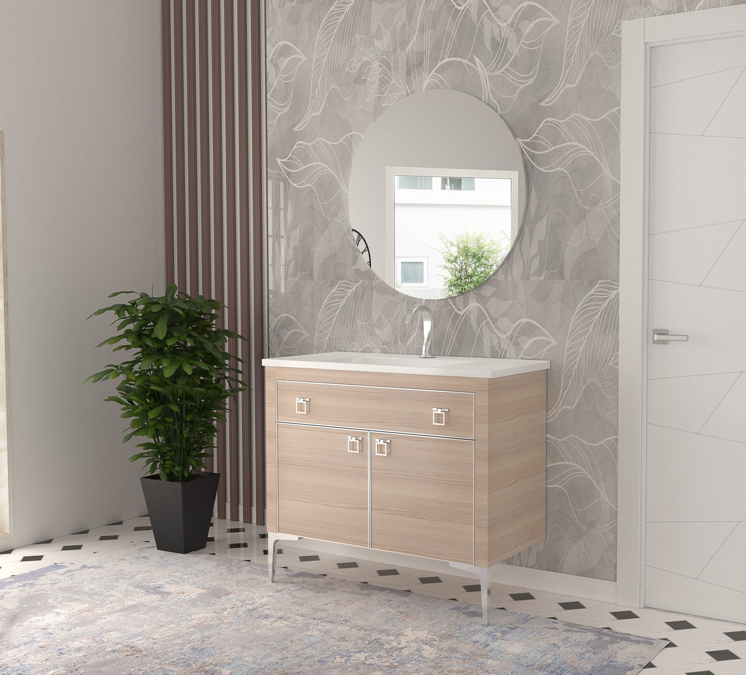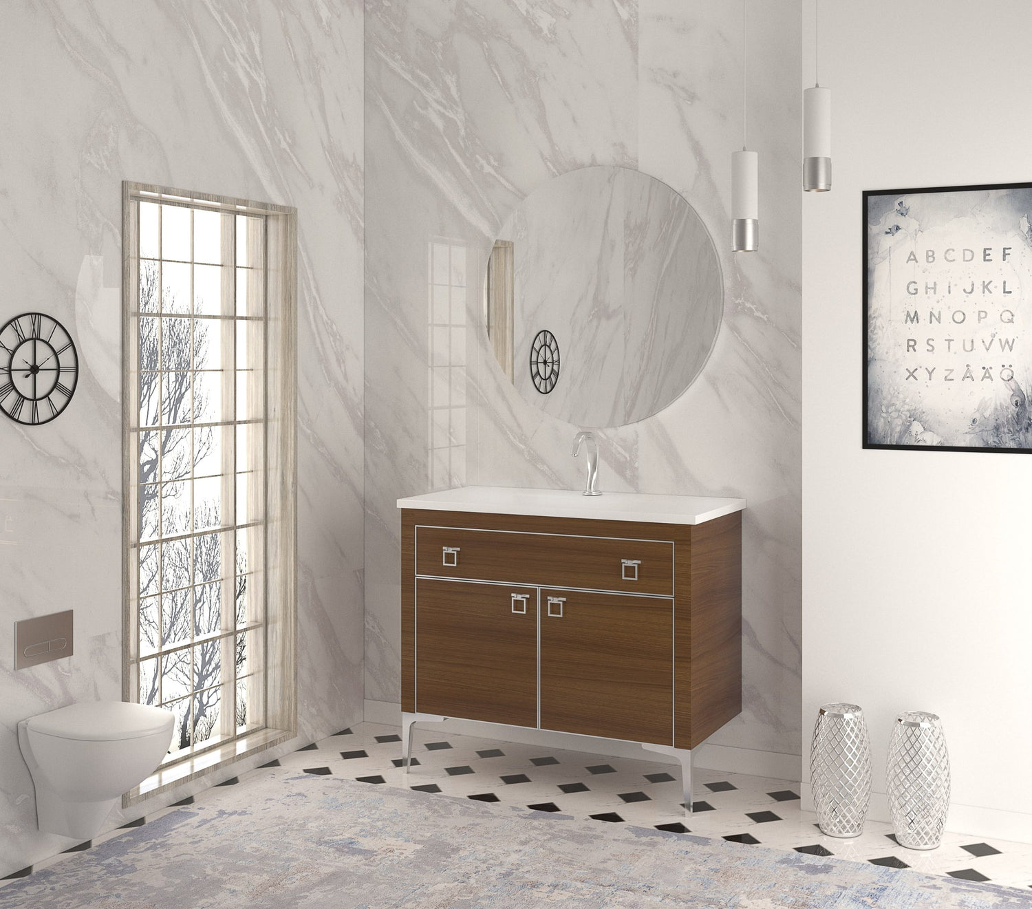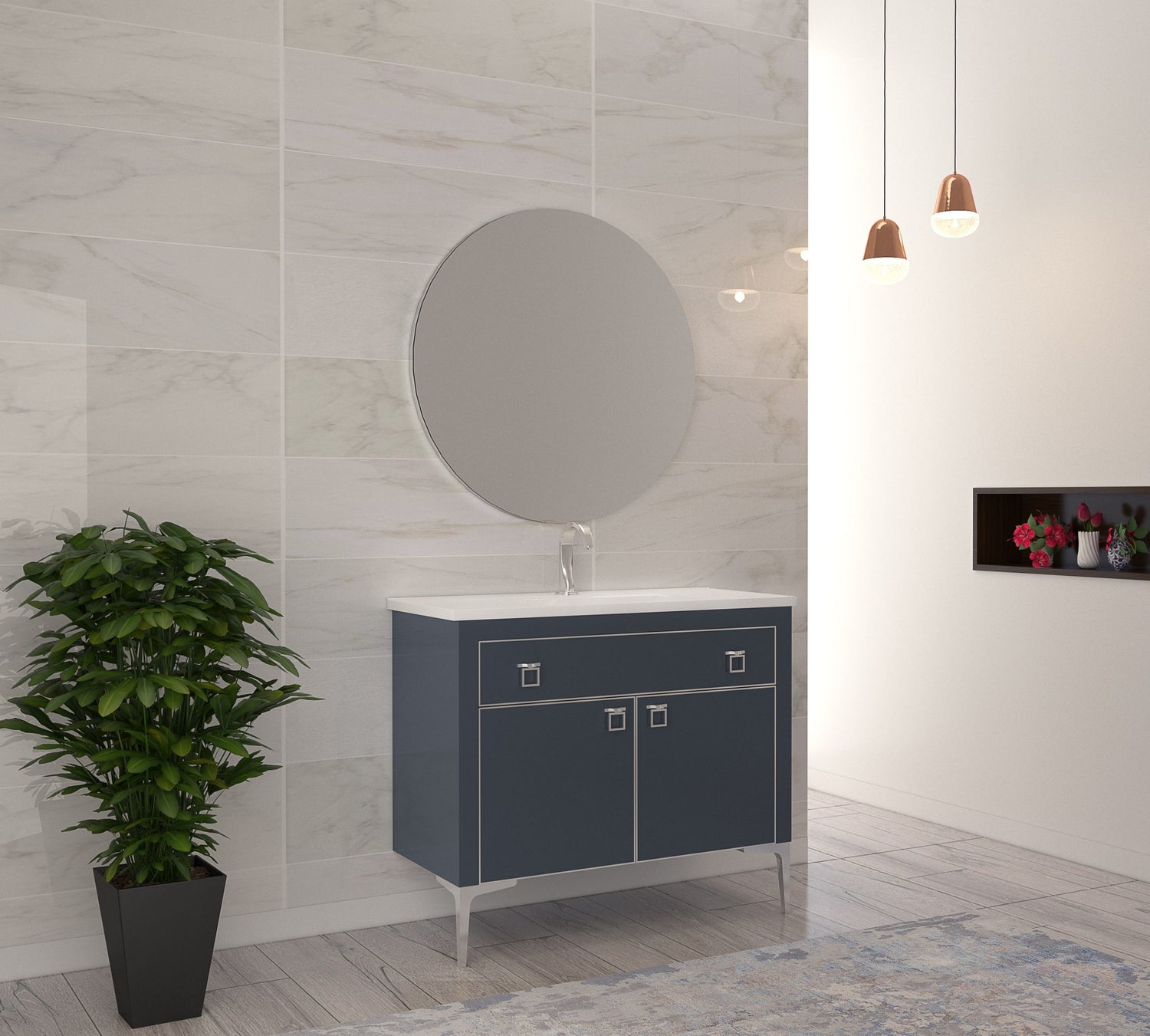 Gold or Chrome profile framed back led mirror, Shiny white ceramic counter top, Cabinet white, darkwood, lightwood, antrachite. Gold or Chrome accessory.