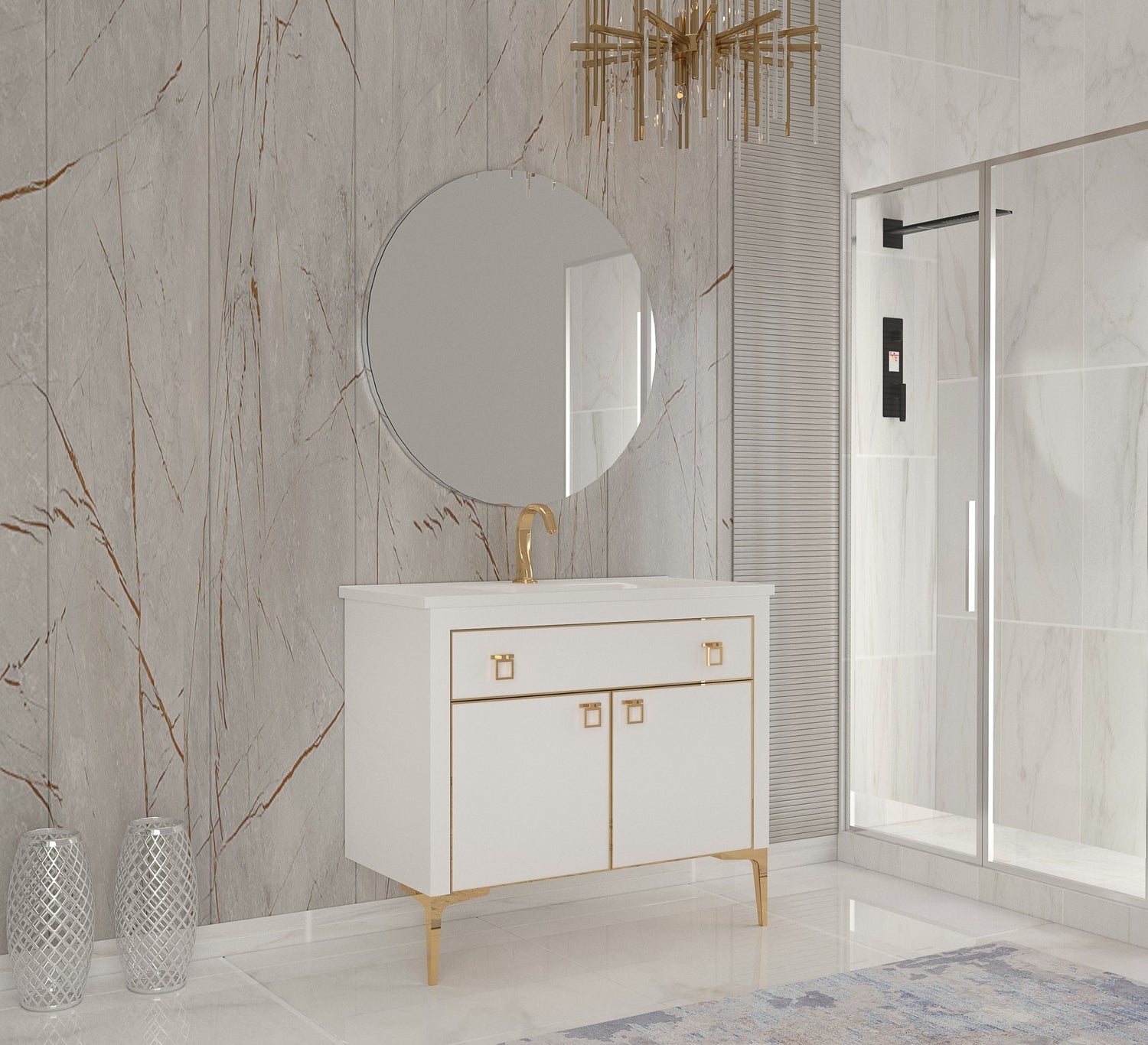 Gold or Chrome profile framed back led mirror, Shiny white ceramic counter top, Cabinet white, darkwood, lightwood, antrachite. Gold or Chrome accessory.