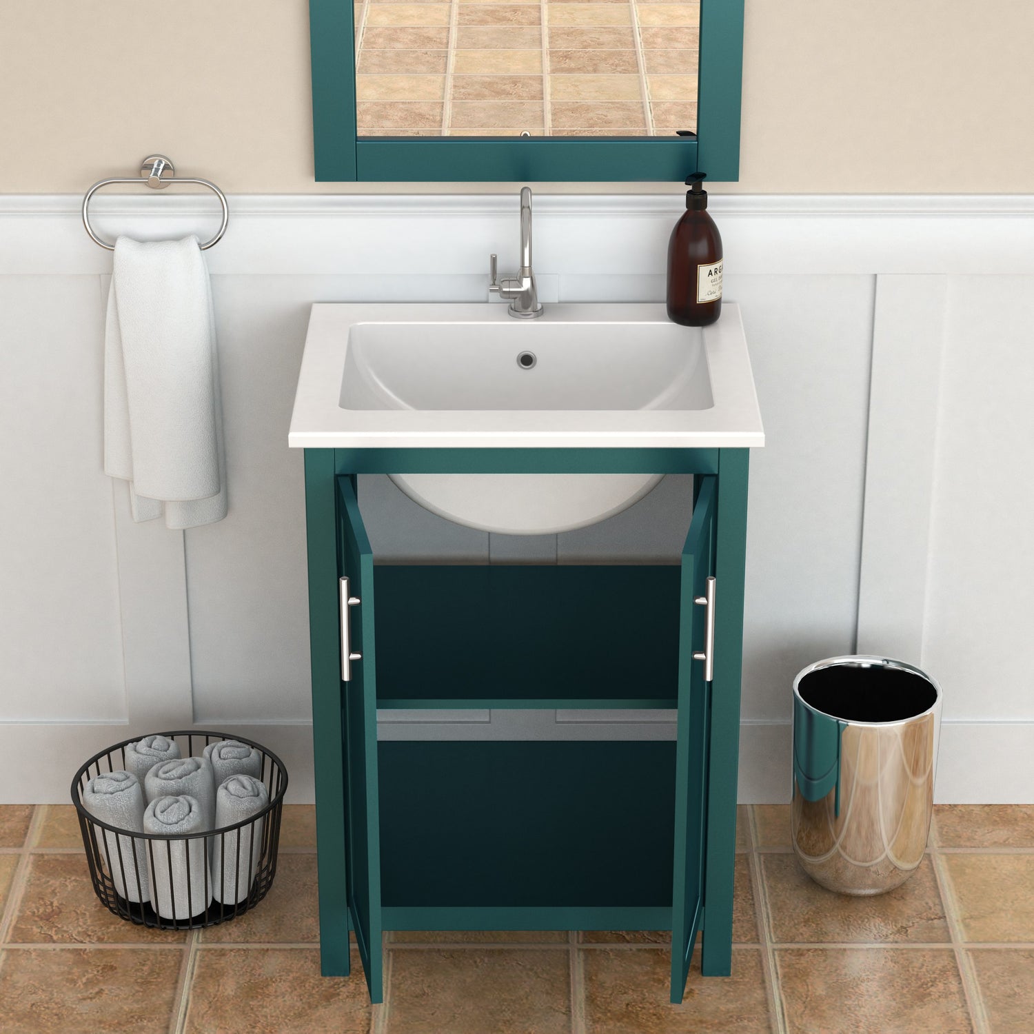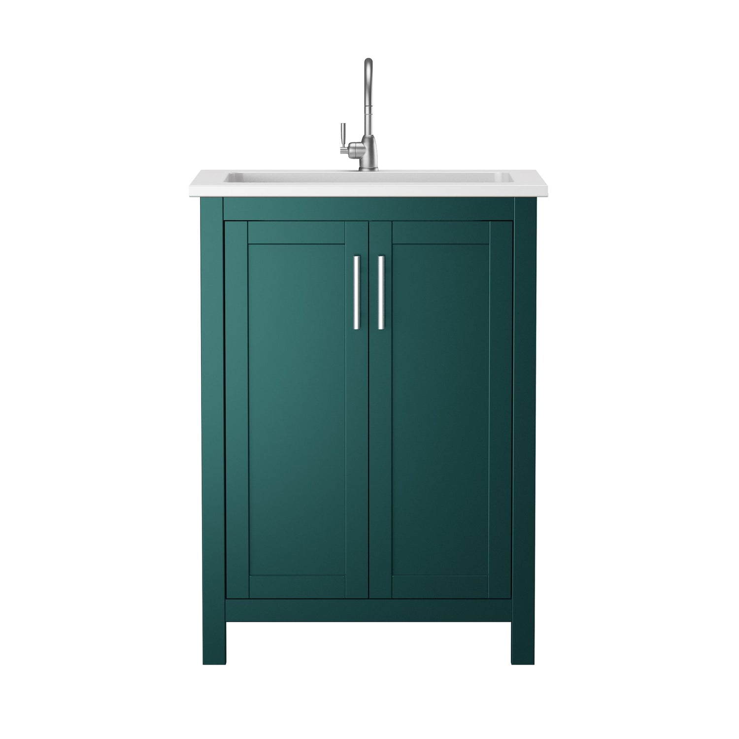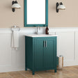 Perfect for the modern home, this 24” freestanding vanity in willow green comes with a ceramic basin and aluminum handles. This sleek design fits in smaller bathrooms and will seamlessly pull your bathroom décor together.
