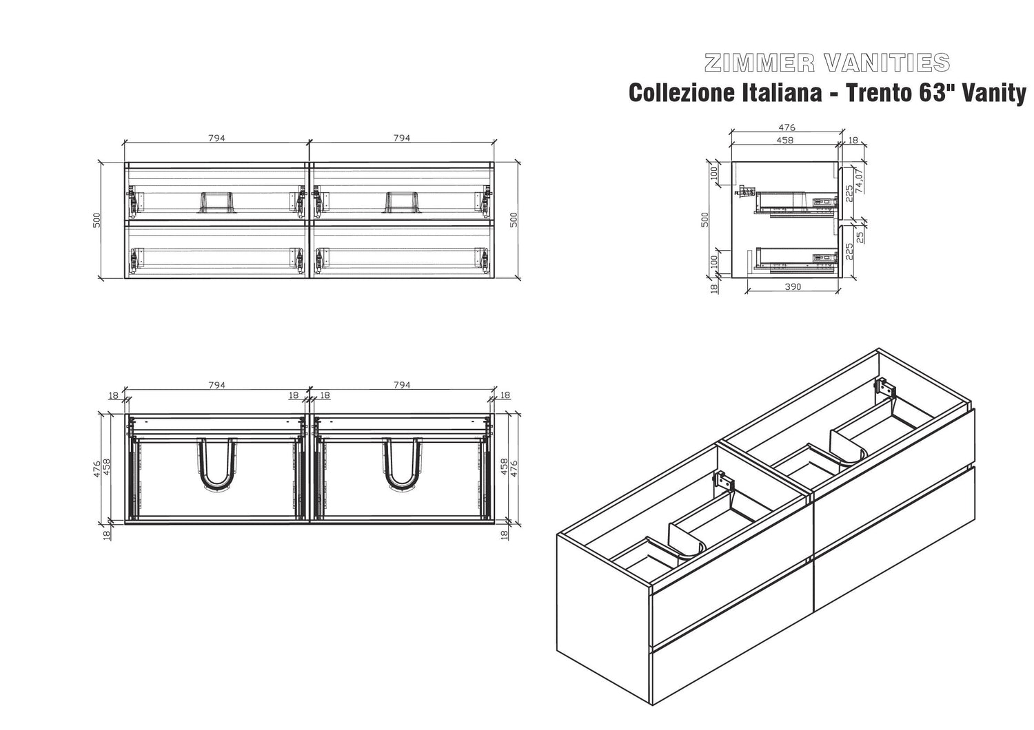 Trento is a modern bathroom vanity wall mount, three finishes available: high gloss white, grey oak, and pine.