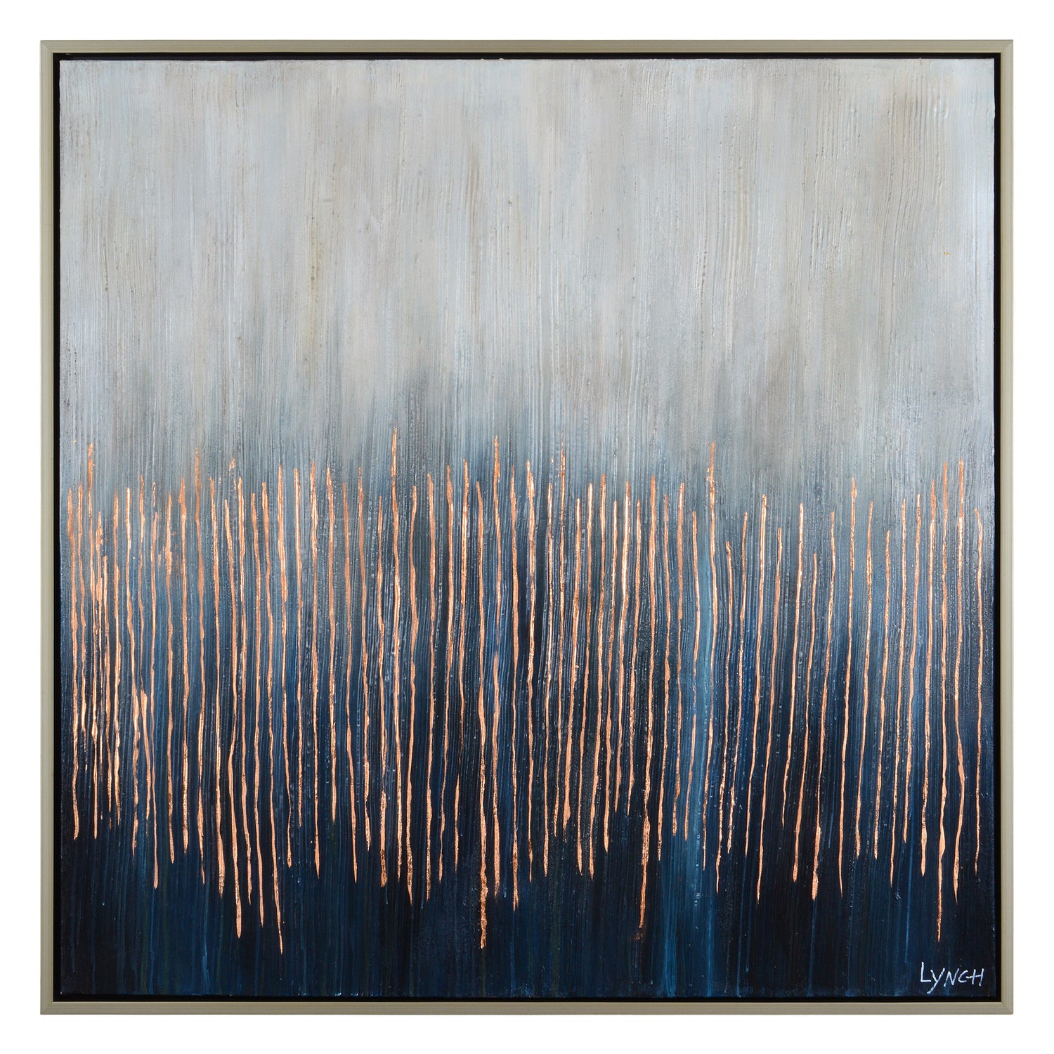 Silvers of shimmering paint shape this abstract canvas painting on the cutting edge of contemporary art. A subdued light blue ombre gradually fades into midnight behind parallel lines of shiny copper leaf. A champagne silver frame captures the metallic accents within the canvas, while the art piece’s interpretive gestures suggest industrial influences.