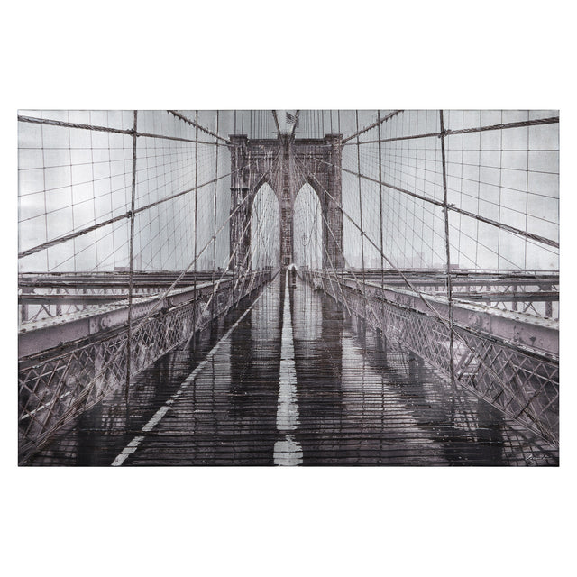 The industrial beauty of the Brooklyn Bridge is captured in the compelling angle of this modern print on canvas that celebrates the art of engineering. Perfect as a feature above a fireplace mantle or sweeping studio wall, the painting’s strong central perspective draws the eye toward the center of the canvas, allowing the architectural details of the bridge to shine. Hand-painted details in black and white tones enhance the photographic quality of this exquisite art piece, highlighting the wet wood plank walkway, geometric grid of steel cables and iconic neo-Gothic stone arches in stunning detail.