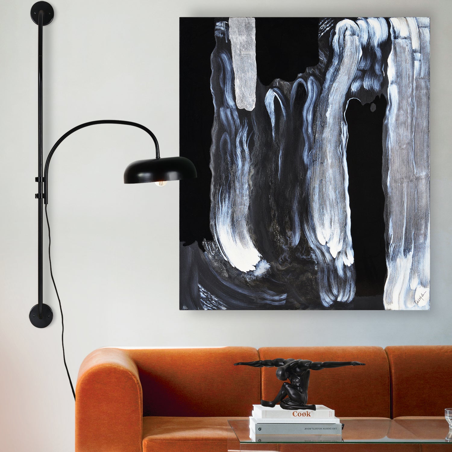 A mysterious quality sits within the hand painted brush strokes of this canvas art painting. Showcasing contrasting dark and light hues, with spot gloss and silver leaf details in the mix, the design is eye-catching without being overpowering. With a canvas edge in solid black, this work of art is best styled with strong, dark pieces that complement its moody impression.