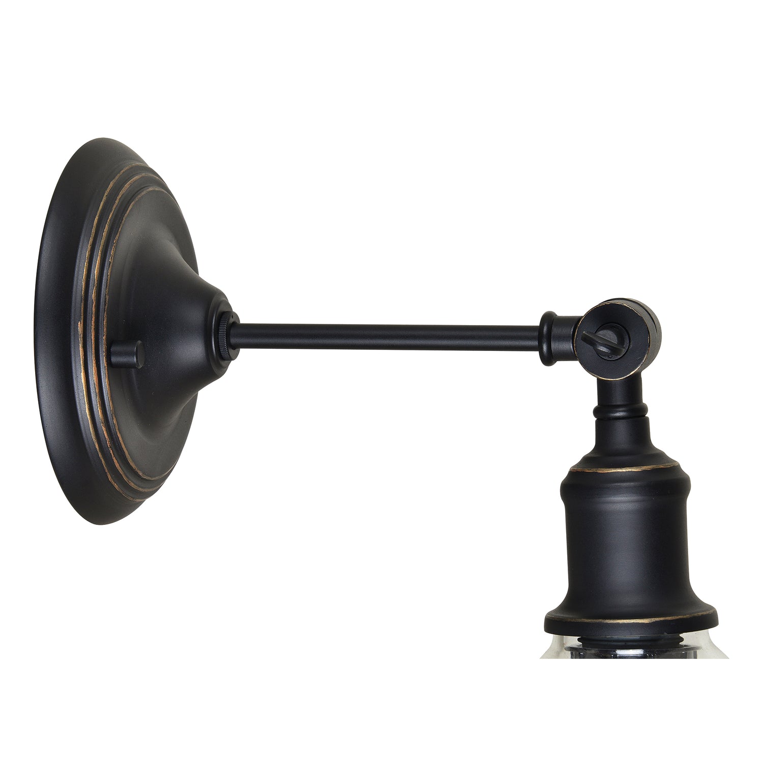 Add instant character to interior walls with the classical design of this traditional wall sconce. The conical clear glass shade captures the radiance of a single light bulb, while the oil-rubbed bronze finish brings just the right amount of Old World charm. An articulating iron arm offers pointed illumination, tilting the light toward and away from the wall.
