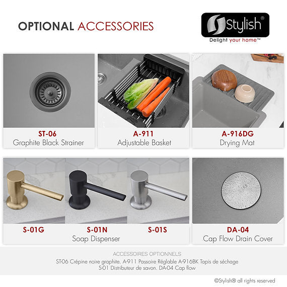 Complete the style and functionality of your sink with our accessories, two ST-01 stainless steel strainers, A-04 metal colander, A-914BK drying rack on wheels, A-909 bamboo cutting board.