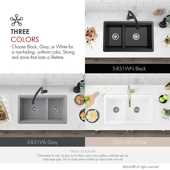 Thick granite, highly scratch-resistant and easy to clean, ensures silent operation. Available in three stunning colors: black, gray and white, this sink promises durable, unalterable colors that will stand the test of time.