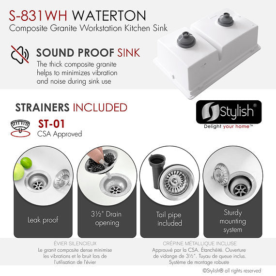 30 inch Dual Mount Workstation Double Bowl Grey Composite Granite Kitchen Sink with Built in Accessories, by Stylish® S-831WH Waterton