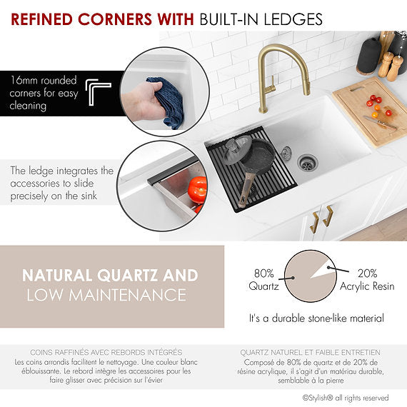 Enhance your kitchen experience with our exceptional 30-inch double bowl, 60/40 double-mount sink. Made of composite granite containing 80% natural quartz, this sink is not only beautiful and durable, but also remarkably low-maintenance.