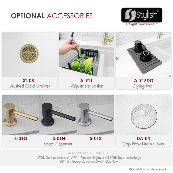 Complete the style and functionality of your sink with our accessories, two ST-01 stainless steel strainers, A-04 metal colander, A-914BK drying rack on wheels, A-909 bamboo cutting board.