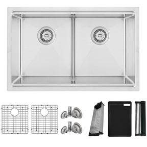 Introducing the new double bowl workstation kitchen sink, a part of the new Stylish Completo series. This sink is engineered to deliver great functionality, style, and value. With a 50/50 double bowl, this 30-inch workstation includes a set of modern and elegant accessories: two protective stainless-steel bottom grids, one steel silicone-coated black drying rack, one black cutting board and one slim stainless-steel colander. Its ledge on the longer sides of the sink allows the accessories to fit and slide perfectly for efficient use. It features a sloped basin with grooves for fast water drainage and underneath it is covered with insulation pads on all sides for silent use. It also includes extra thick bottom pads that will protect your kitchen cabinet from condensation. This sink is made from premium material, using the thickest 16-gauge 304 stainless steel with 18/10 chrome/nickel content, and featuring a commercial-grade satin finish to hide marks and scratches. This sink features gently rounded corners all around to make cleaning as simple as wiping the surface with a damp cloth. This sink is designed to be installed as drop-in or undermount, it includes the installation hardware and comes with an all-metal drain strainer.