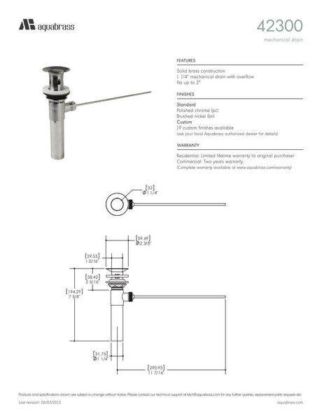 1 1/4" long square press pop-up drain