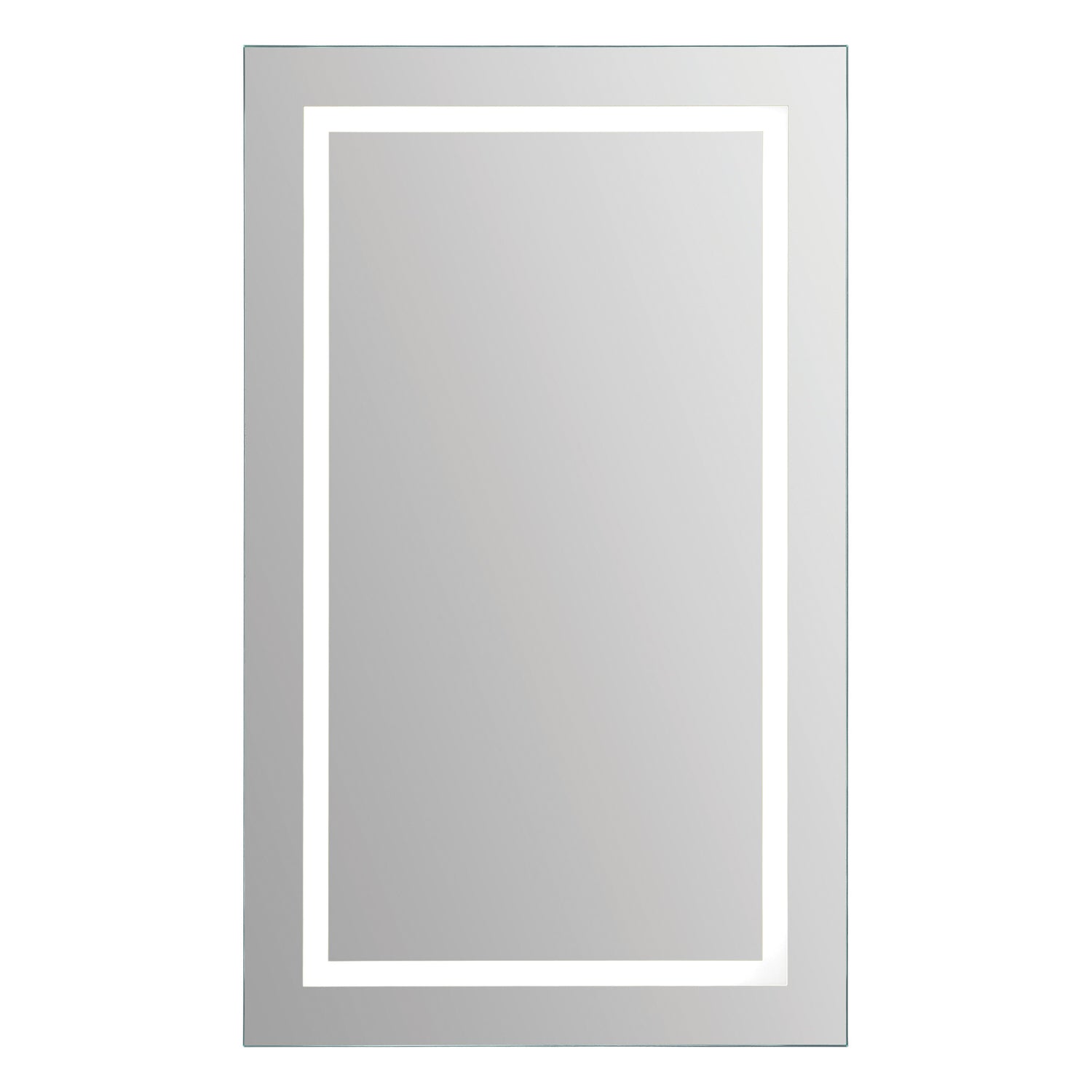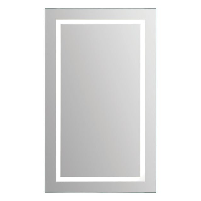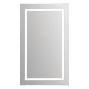 A rectangle border of LED light shines through this mirror, making it both a beautiful piece of decor and a functional lit mirror. Can be surface or recess mounted. The light on the border is a 3000 Lumen, 28.8 Watt, 4000 Kelvin, non-dimmable LED strip with a 50,000 hour lasting lifetime.
