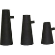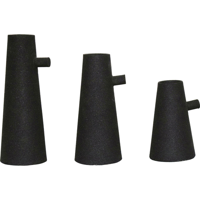 Combining organic inspiration with modern design, this set of three vases brings a designer quality to the home. Made of powder-coated iron with a texture matte black finish, the pieces feel timeless and chic. While the vases are similar in width, each one has a different height.