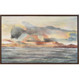 This work of art is expansive in size and character. This hand-painted cotton canvas brings the meditative feel of staring out to sea right into the traditional interior space. The dark brown floating frame acts as a rich accent that grounds the soft hues of blue and beige.