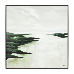 A mystifying, calming quality envelops the entryway, bedroom or living room interior through this art painting. The dark frame of this design enhances its seaside illustration and adds drama to its influence overall. Clients seeking a piece of canvas art for the organic, contemporary style home will find this design completes the nature-inspired feeling they are hoping to establish.