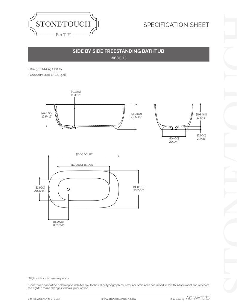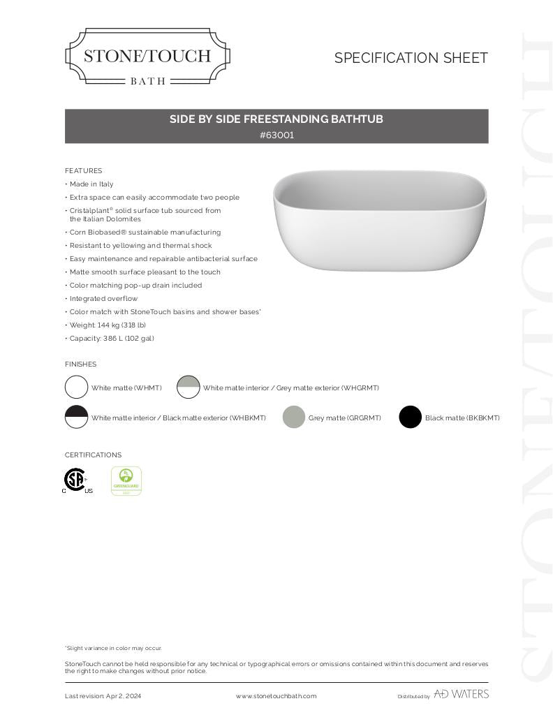 Each StoneTouch bathtub is expertly crafted with the finest and sustainable materials, carefully sourced from the picturesque Dolomites Mountains in Italy and renowned for their pristine natural beauty.Experience the ultimate in romantic relaxation and comfort with our free-standing Side by Side Stonetouch bathtub. Its generous size also caters to individuals who seek additional space to enjoy a long and well-deserved bath time experience. The Side by Side bathtub also offers an expansive space for two, allowing luxurious indulgence you won