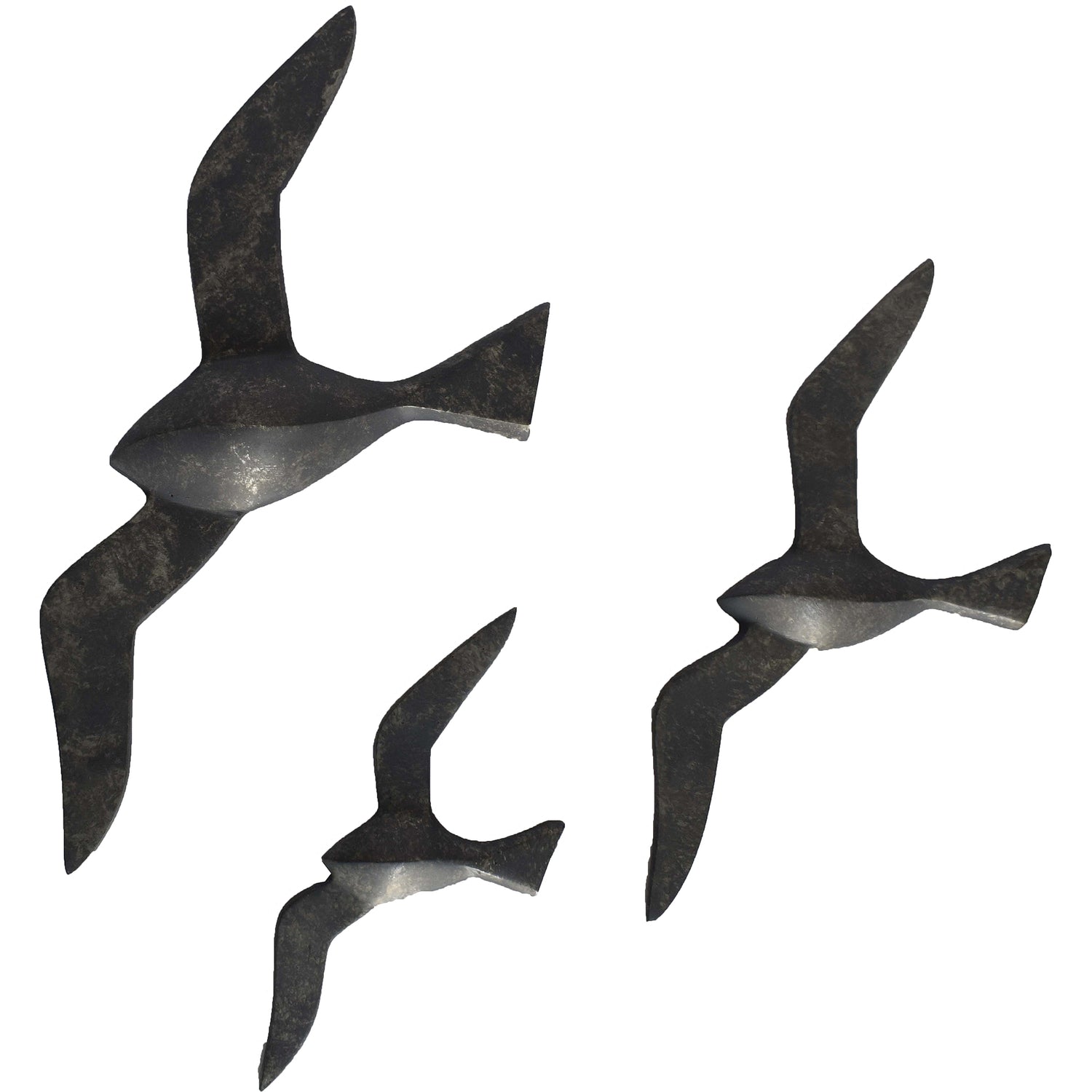 The soaring silhouette of a small flock of seagulls inspires this avian set of three metal wall art decorations. The aluminum figures of the small, medium and large bird wall statues flash as they fly in formation across your interior atmosphere. An antique charcoal finish adds industrial patina to each traditional wall decoration.