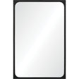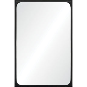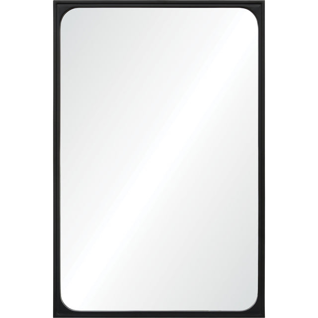 The sophisticated styling of this traditional wall mirror reveals a raw, yet refined charm. The carved wood mirror frame clips the rectangular looking glass into neatly curved corners, gently rounding at the inner edges. A black powder coated finish adds a hint of industrial chic to the decorative mirror’s farmhouse influences.