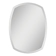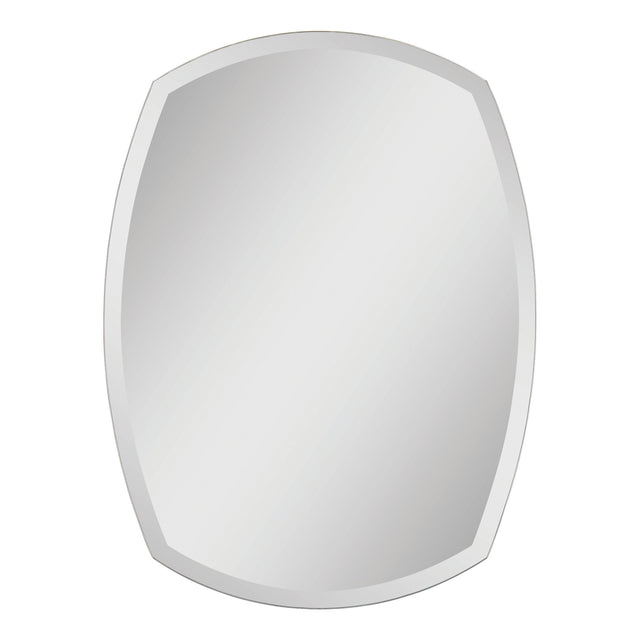 This contemporary mirror has a unique shape that would have a great designer effect in a bathroom. It has beveled and polished edges. The mirror is attached to a backing with strong hangers.