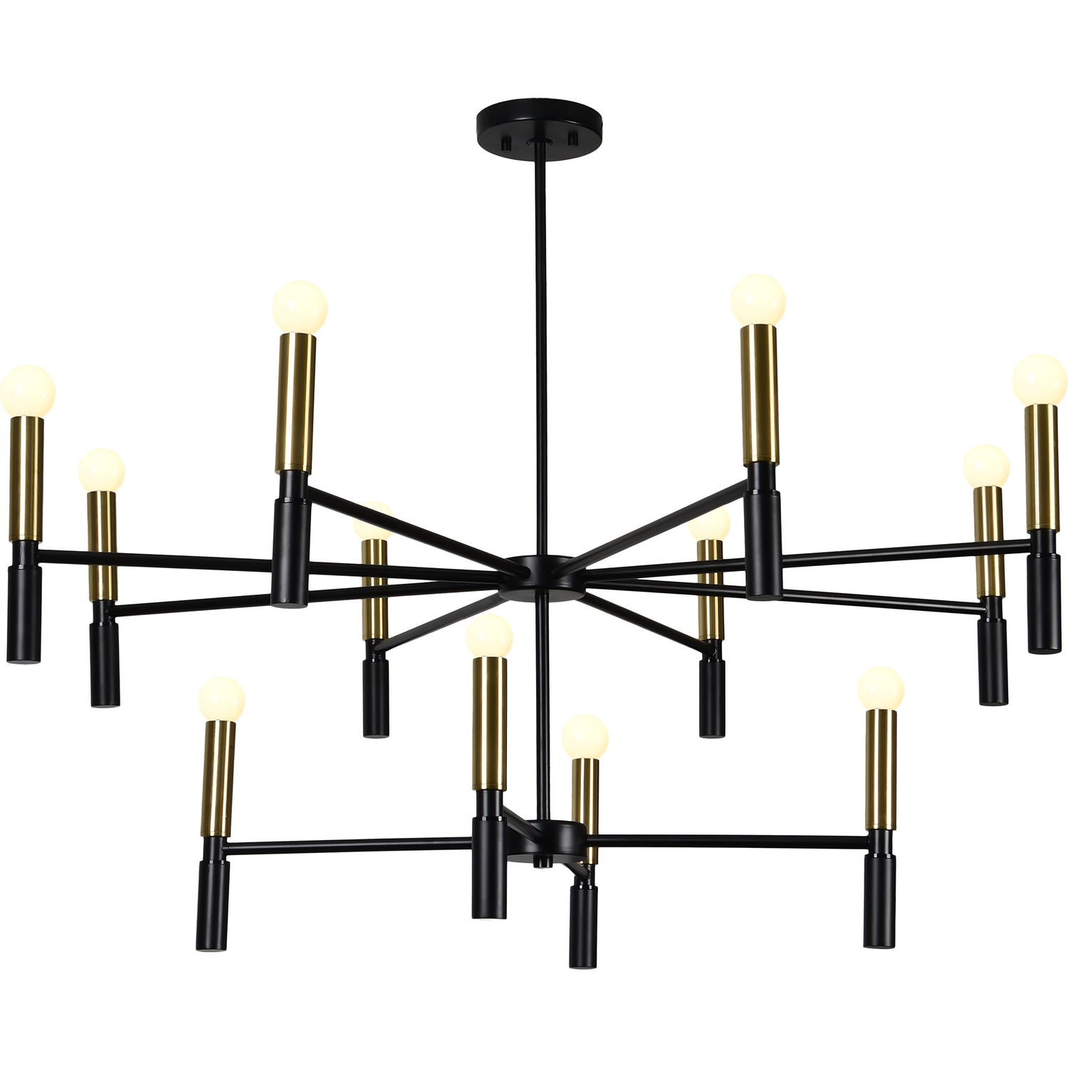 A double layer of lights to hang over your dining room table. This modern design features black powder coated iron arms with satin brass plated accents. Twelve round bulbs (included) complete the statement.