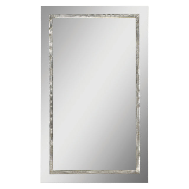 The Stanton Mirror features a sophisticated ribbed metal inlay with a stunning satin nickel finish.