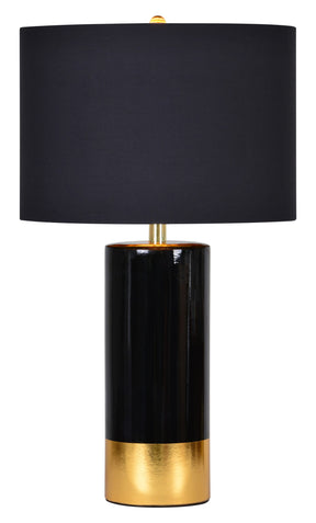 This black and gold contemporary table lamp brings a touch of Hollywood glamour to any interior. A solid black round shade is lined in gold, reflecting the colors in the base.