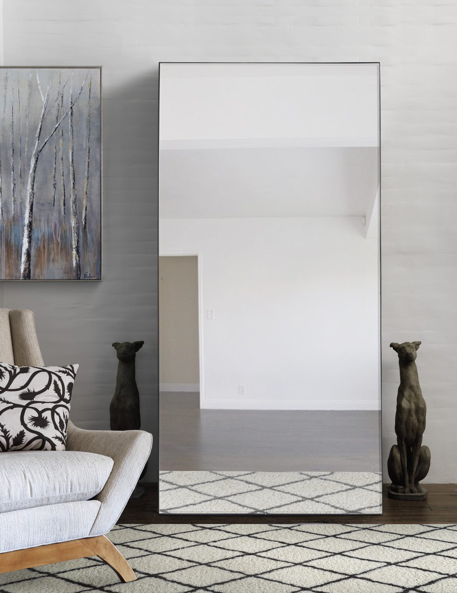 The understated design of this full-length wall mirror exudes classic cool. The thin profile of the iron frame features a black finish that fits beautifully on feature walls in formal and casual rooms. The streamlined style of the rectangular mirror is an instant standout among modern fixtures and furnishings.