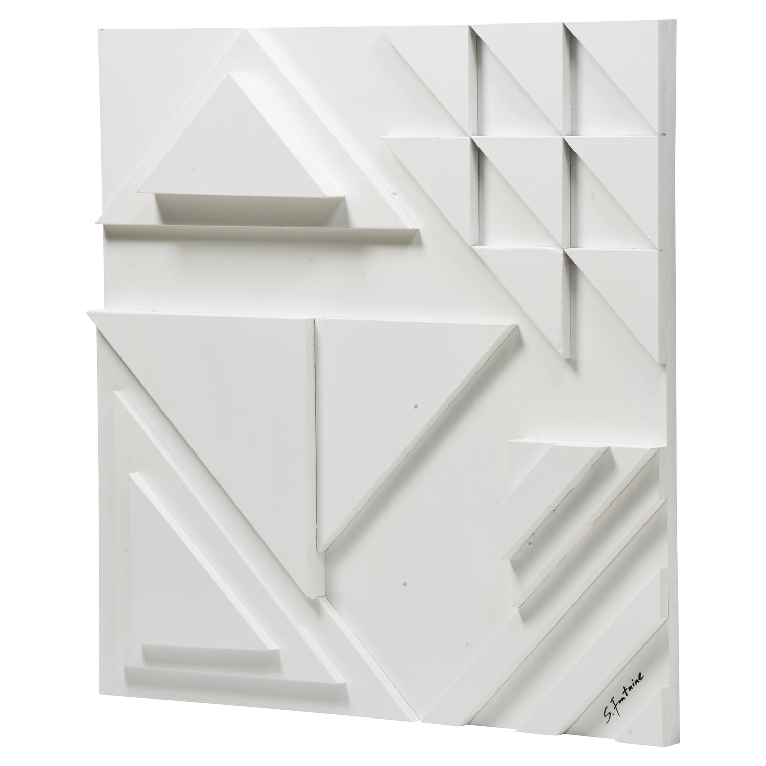 High-relief stripes and assorted stacked triangles create the stark composition of this three-dimensional geometric wall decoration. The minimalist Matte white finish strips away unnecessary conventions of color. The interpretive nature of the abstract art piece can be hung horizontally or vertically, providing a sense of purpose to an empty interior wall.