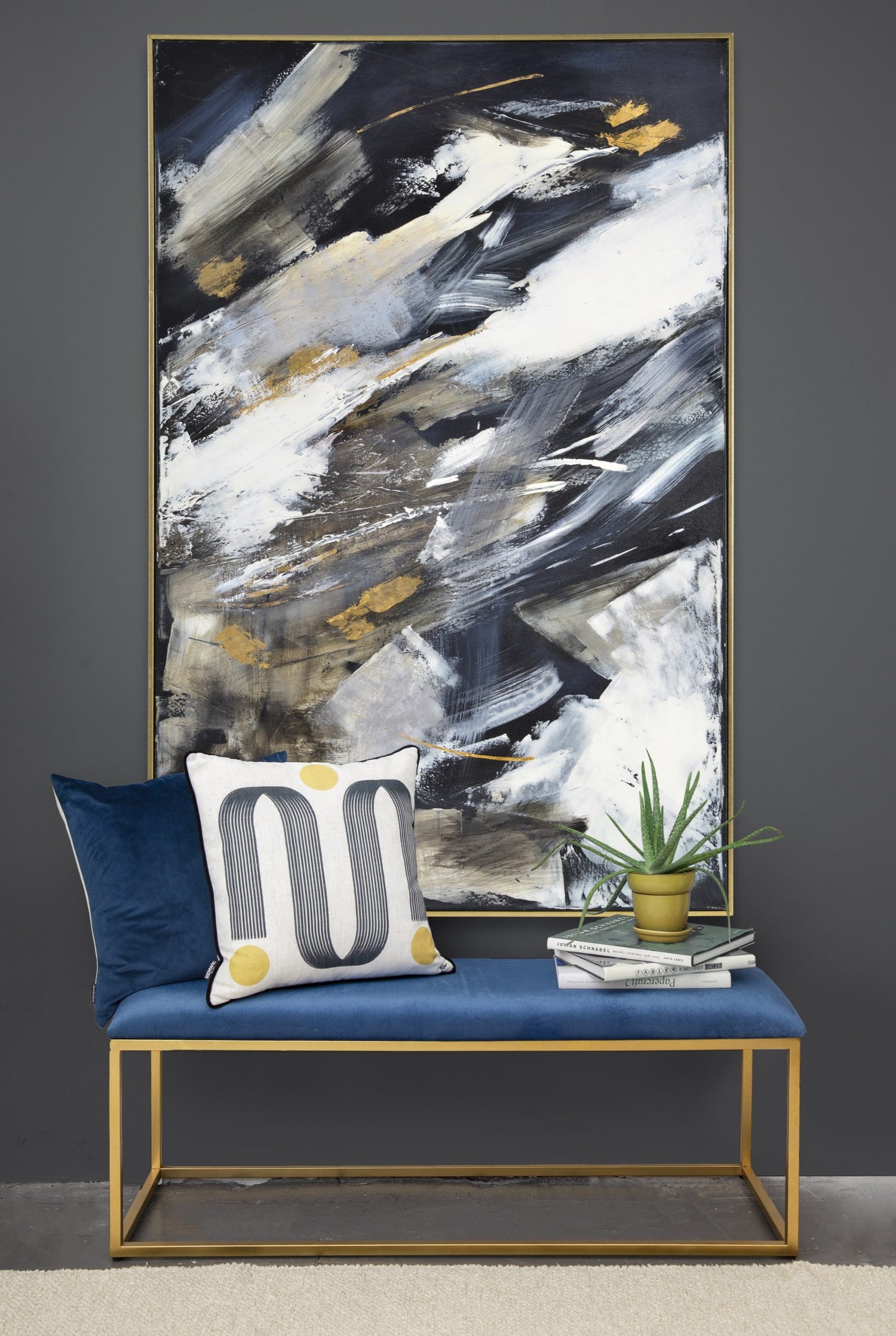 Strokes and splashes collide in harmony in this hand-painted canvas. With a bold navy blue backdrop and pops of gold and white, this piece has a luxe style fit for the contemporary dining room.